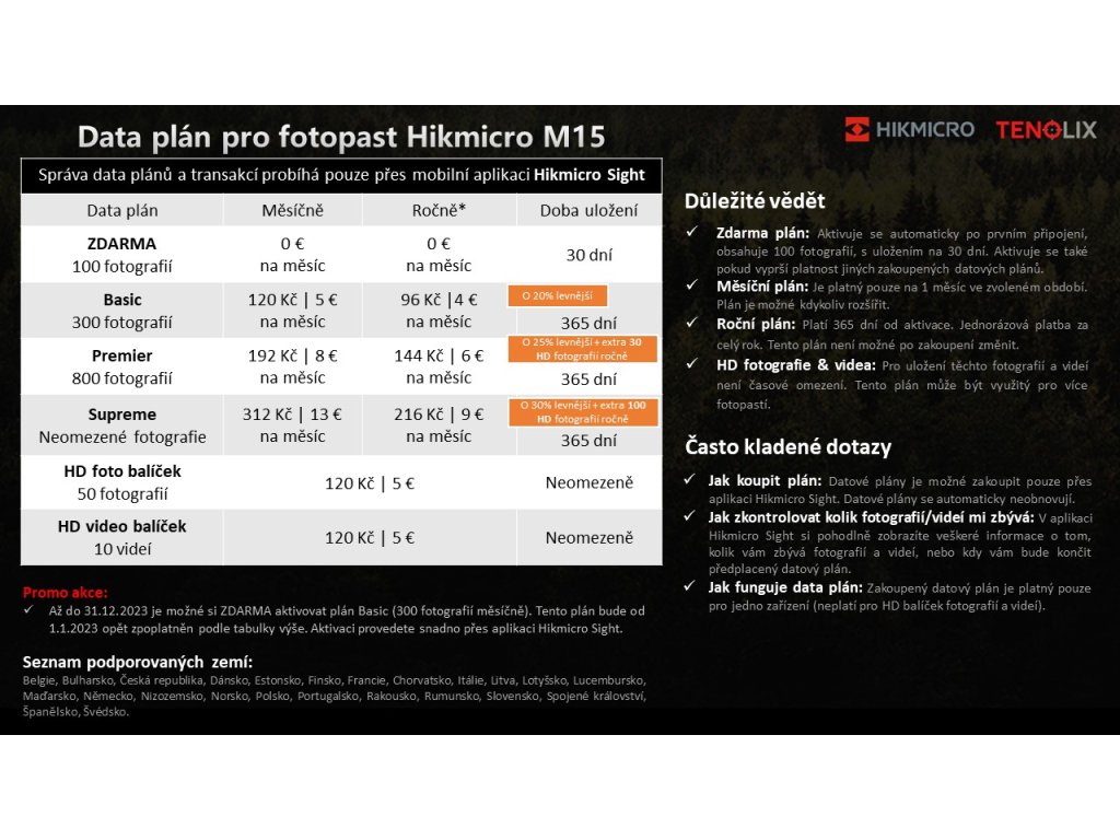 Fotopast má zabudovanou SIM kartu, která bez problému funguje v ČR i SK ihned po zakoupení a není potřeba si ji předplácet. Zpoplatněné je pouze stahování pořízených fotografií a videí přes aplikaci HIKMICRO Sight. Základní plán 100 zobrazených fotografií měsíčně je ZDARMA. Přehled data plánů naleznete ZDE.