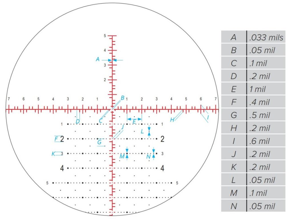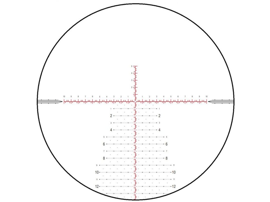 - Jednoduchý středový bod pro presné zaměření, odrážky po 0.2 MRAD na hlavních linkách pro snadnou výškovou a stranovou korekci