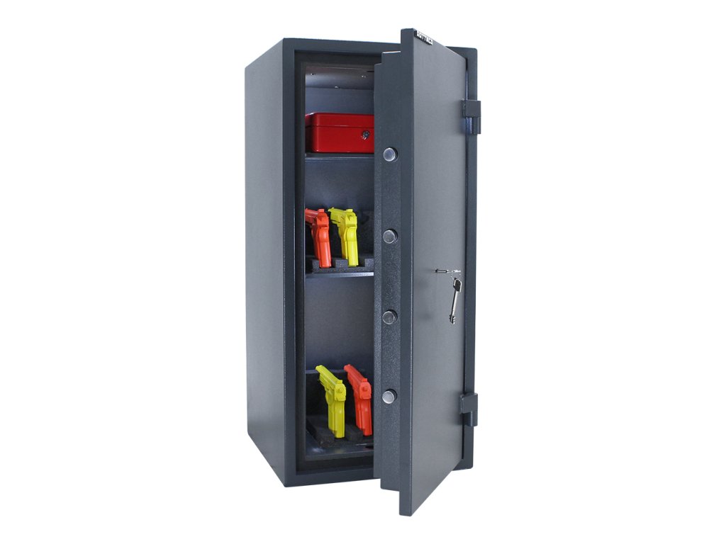 Hlavní výhody: Certifikovaný elektronický zámek Bezpečnostní třída I (ČSN EN 1143-1) Ohnivzdornost po dobu 30 minut pro papír 3-stranný uzamykací mechanizmus Korpus tloušťky 56 mm a dveře tloušťky 95 mm Nastavitelná polička uvnitř Otevření dveří až do 180° Otvory na ukotvení na spodní straně trezoru Trezor Fire Hero 100 v antracitovém barevném provedení disponuje certifikovaným trezorovým zámkem dodávaným spolu s 2 klíči. Jednoduchý ale funkční design poskytne bezpečný prostor pro uložení cenností, šperků ale i šanonů nebo jiných kancelářských dokumentů. Výhodou trezoru je bezpečnostná třída I (ČSN EN 1143-1) a ohnivzdornost. Působení ohně vydrží až po dobu 30 minut pro papírové dokumenty. Uvnitř trezoru se nachází nastavitelná polička. Spodní strana má připravené otvory pro ukotvení. Kotvící materiál je součástí balení. Kování zvyšuje celkovou vnější hloubku trezoru o 15 mm.