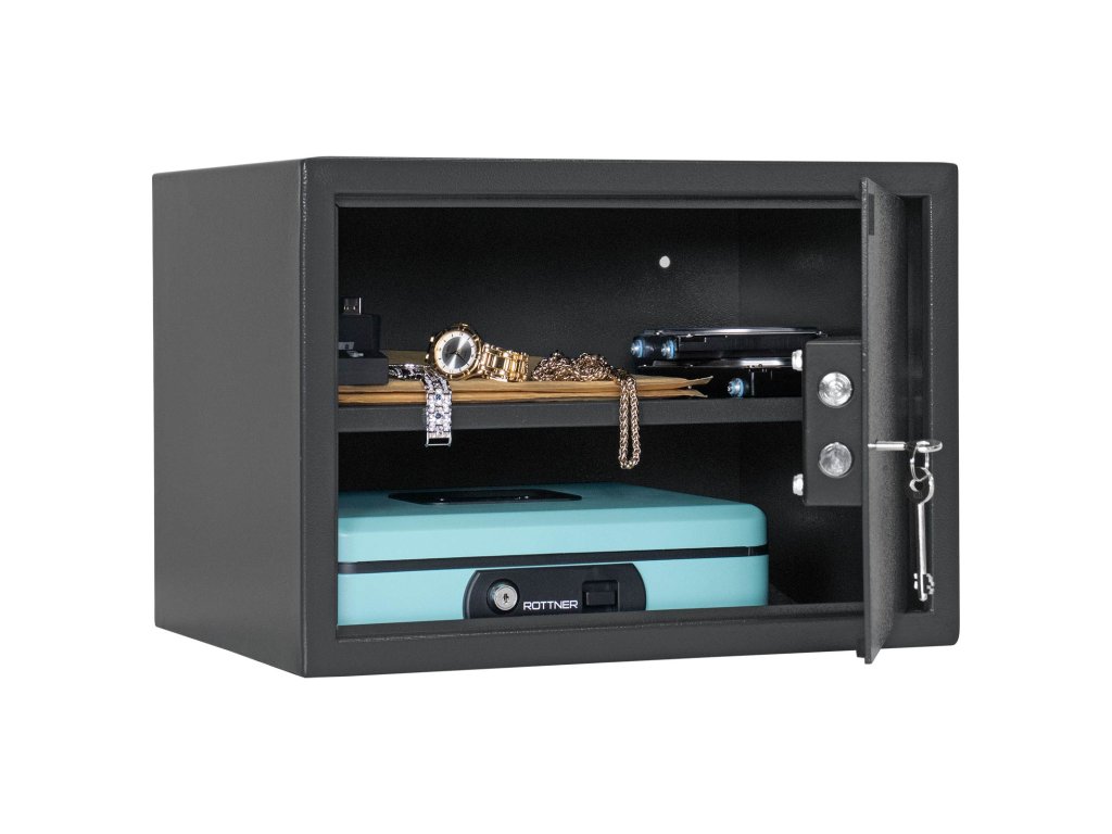 Hlavní výhody: Trezorový zámek na klíč Jednoplášťový sejf 1 police vyjímatelní Otvory pro ukotvení na spodní i zadní straně trezoru Nábytkový sejf z modelové řady Jupiter má klasický trezorový zámek dodávaný spolu se 2 klíči. Uvnitř sejfu najdou své místo malé cennosti, doklady, hodinky nebo menší šperky. Sejf lze ukotvit prostřednictvím připravených otvorů na spodní i zadní straně. Materiál pro ukotvení je součástí balení. Pro tuto schránku na zbraně je stanoveno, že při přechovávání krátkých zbraní do počtu 2 ks nebo do 500 ks nábojů plati prohlášení o shodě.