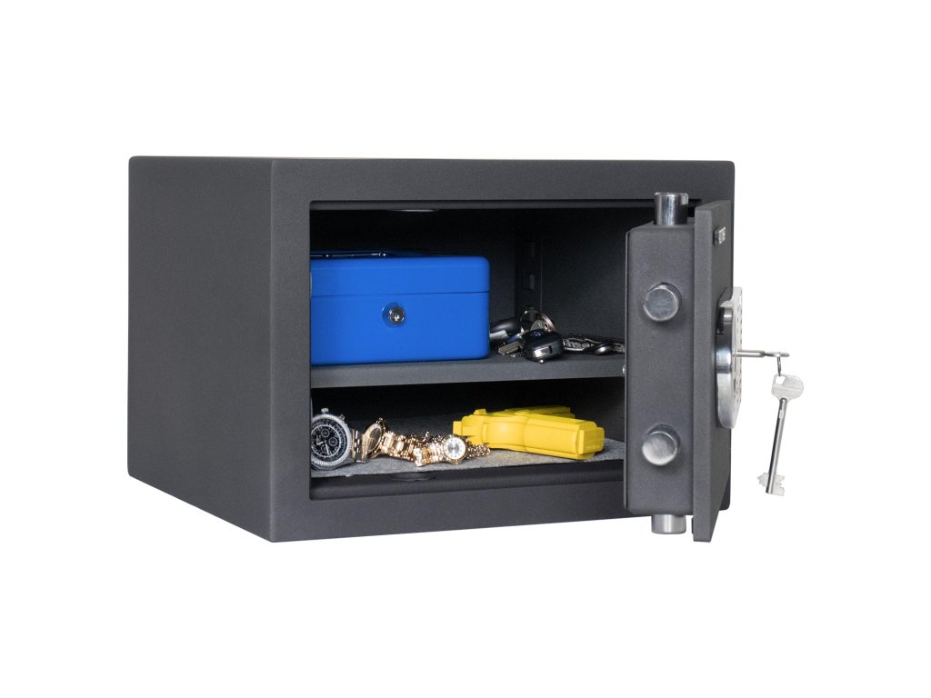 Hlavní výhody: Certifikovaný trezorový zámek s 2 klíči Bezpečnostní třída I (ČSN EN 1143-1) Trezor má dvouplášťové dveře s tloušťkou 12 mm Dveře trezoru lze otevřít v úhlu 90° Rozvorový uzamykací mechanizmus zajistí uzamčení na 3 stranách. Dodávané s 1 vyjímatelnou poličkou Otvory na ukotvení na spodní a zadní straně trezoru Dvouplášťový nábytkový trezor nabízí zabezpečení uložených cenností zamykáním na trezorový zámek a je držitelem bezpečnostní třídy I (ČSN EN 1143-1). Uzamčení zabezpečuje 3-stranný mechanismus, aby všechny uložené cennosti, drobnosti nebo cestovní doklady byly v bezpečí. Vnitřek je vybaveno vyjímatelnou poličkou, která umožní rozvržení vnitřního prostoru. Trezor můžete ukotvit na spodní i zadní straně. Kotvící materiál je součástí dodávky. Kování zámku zvyšuje celkovou vnější hloubku trezoru o 15 mm.