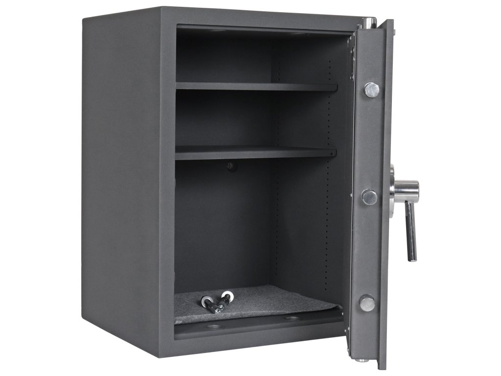 Hlavní výhody: Certifikovaný elektronický zámek Bezpečnostní třída I (ČSN EN 1143-1) Napájení 1 x 9V baterií (není součástí balení) Trezor má dvouplášťové dveře s tloušťkou 12 mm Dveře trezoru lze otevřít v úhlu 90° 3-stranný uzamykací mechanizmus Dodávané s 2 vyjímatelnými poličkami Otvory na ukotvení na spodní a zadní straně trezoru Certifikovaný trezor z modelové řady Toscana nabízí certifikát bezpečnostní třídy I (ČSN EN 1143-1), takže uložené cennosti, dokumenty nebo šanony budou v bezpečí. Kromě zmíněných věcí můžete uschovat i krátké zbraně a munice. Do prostoru se dokonce vejdou i menší pokladničky. Elektronický zámek je napájen klasickou 9V baterií. Dvouplášťové provedení trezoru dostalo tloušťku 12 mm. Pohodlné ukládání a vybírání věcí zajistí trezorové dveře s možností otevření až do 90°, které se po zadání kódu uzamknou 3-stranným uzamykacím mechanismem. Vnitřní dispozici lze měnit pomocí 2 výškově nastavitelných poliček. Trezor upevníte na podlahu nebo o zeď pomocí připravených otvorů pro ukotvení. Kotvící materiál je součástí dodávky. Kování zámku zvyšuje celkovou vnější hloubku trezoru o 60 mm.