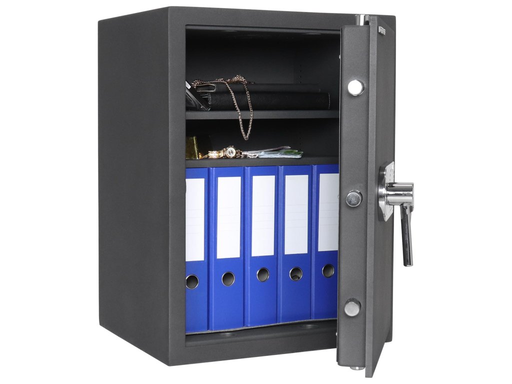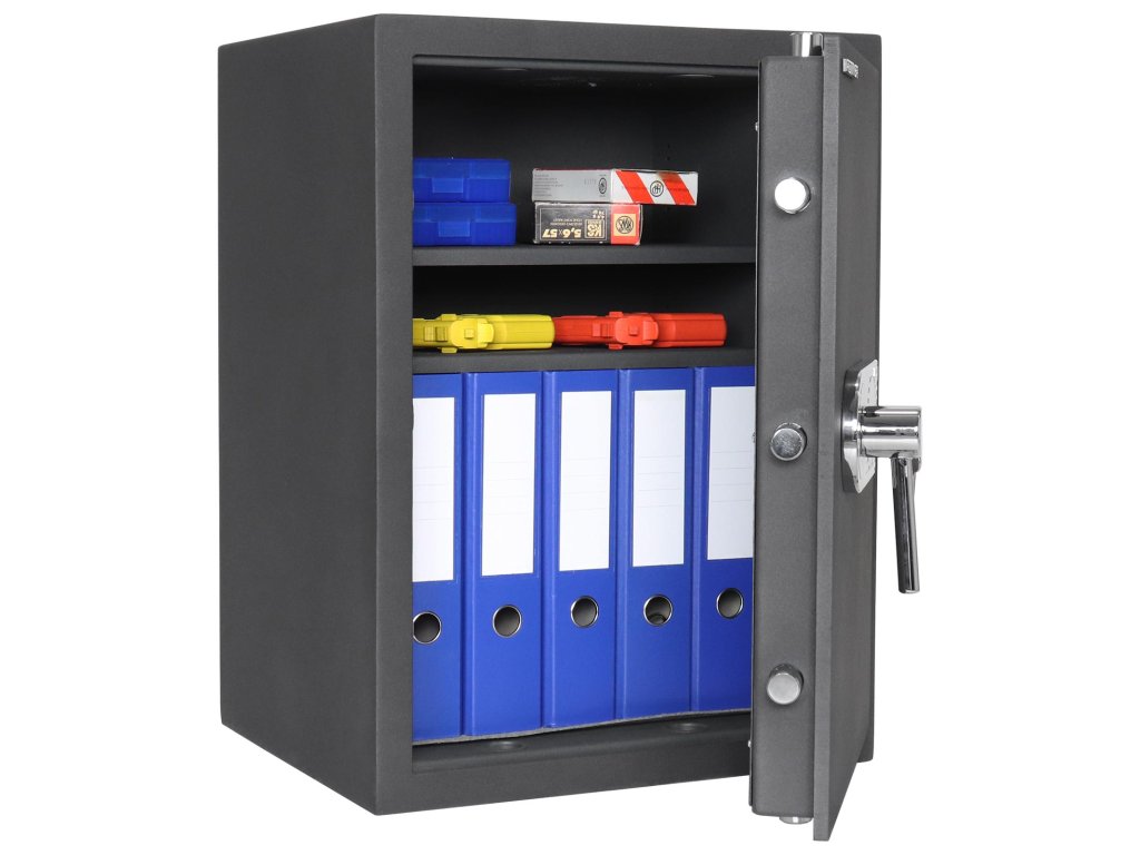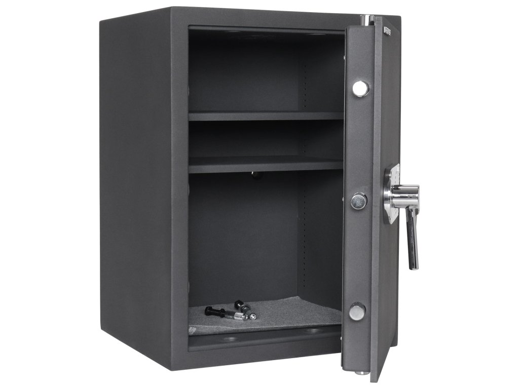 Hlavní výhody: Certifikovaný trezorový zámek s 2 klíči Bezpečnostní třída I (ČSN EN 1143-1) Trezor má dvouplášťové dveře s tloušťkou 12 mm Dveře trezoru lze otevřít v úhlu 90° 3-stranný uzamykací mechanizmus Dodávané s 2 vyjímatelnými poličkami Otvory na ukotvení na spodní a zadní straně trezoru Dvouplášťový trezor nabízí ochranu bezpečnostní třídy I (ČSN EN 1143-1) spolu s trezorovým zámkem a 2 klíči. Korpus hrubý 12 mm se postará o všechny cennosti, doklady, pokladničky, šanony a jiné, pro vás důležité věci. 3-stranný uzamykací mechanismus. Pro dobrý přístup do trezoru je možné dveře otevřít až do úhlu 90°. Vnitřní prostor si upravit podle vašich požadavků, a to i díky 2 výškově nastavitelným poličkám. Připraveno otvory na spodní a zadní straně usnadňují ukotvení trezoru. Kotvící materiál je součástí dodávky. Kování zámku zvyšuje celkovou vnější hloubku trezoru o 60 mm.
